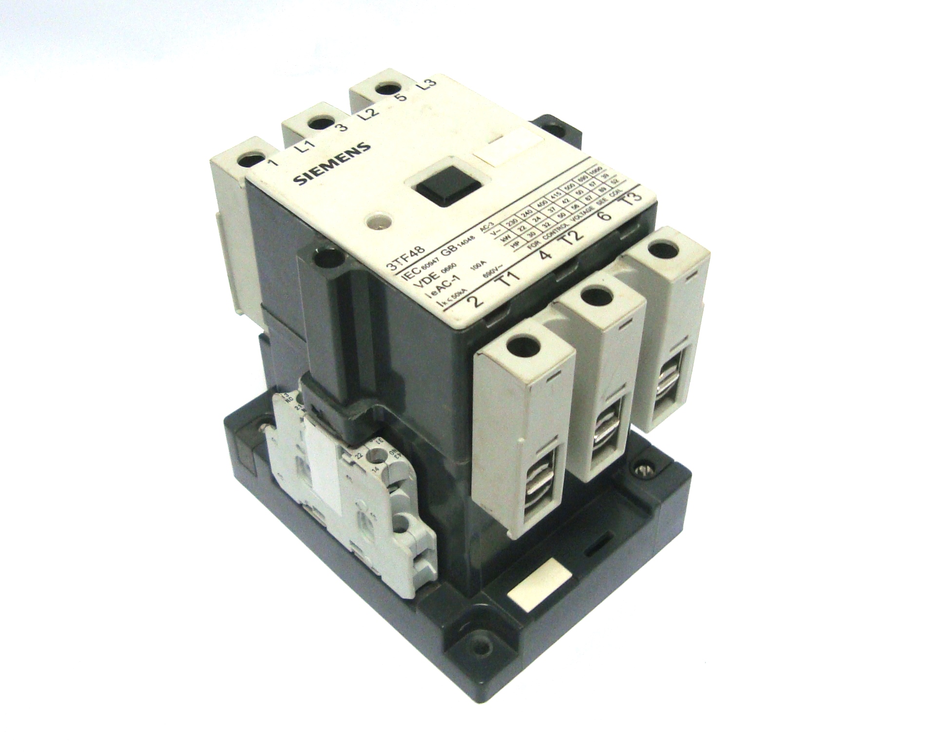 CONTATOR TRIPOLAR BOBINA 110V 50Hz 127V 60Hz, AC-3 230V, 22kW, 240V, 24kW, 400V, 37kW, 415V, 42kW, 500V, 50kW, 690V, 67kW, 1000V, 39kW, 100A 50kA, 2NO + 2NC. COD. 3TF48220XN1110V